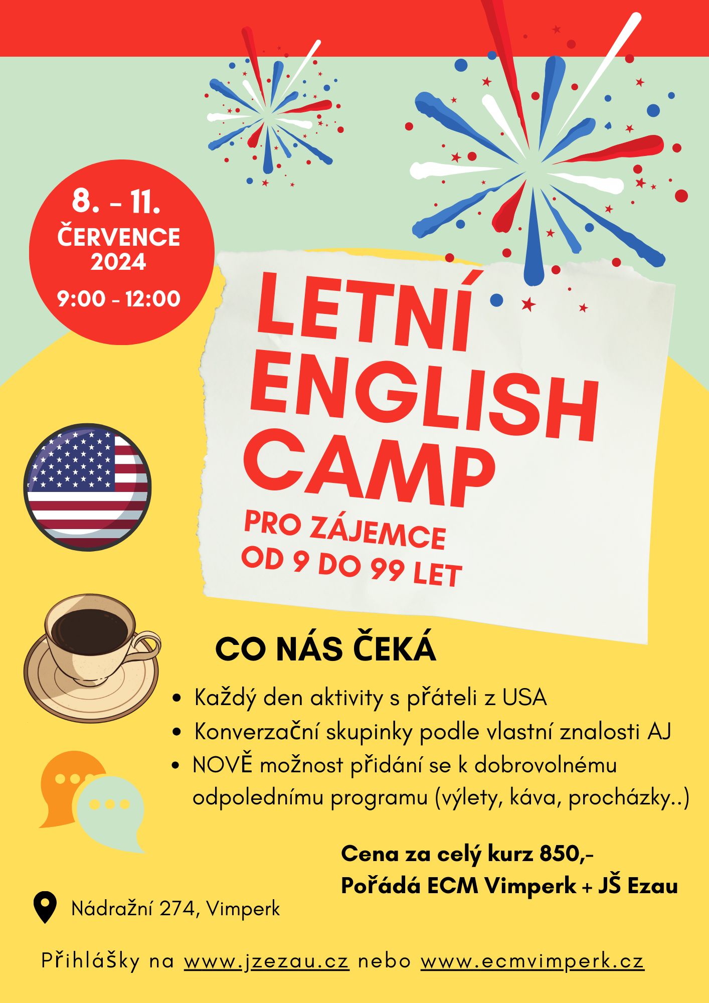 Stravováni je zajištěno. Dopoledne je svačina, pak oběd. Po obědě se jde do tělocvičny, kde mají děti možnost si zahrát hry. Pak jsou děti rozdělené do skupin dle znalosti anglického jazyka a konverzují s Američany, kteří pro ně mají připravené různé zábavné a zároveň poučné aktivity. Po pobytu v tělocvičně následuje svačina, po které se vracíme opět na hřiště, kde jsou hry a baseball. V 17:15 se odjíždí na večeři do Vimperka (Hamajda), kde zhruba v 18:00 hodin si rodiče vyzvednou děti, či se sami vypraví domů. Ve čtvrtek je v budově církve závěrečné setkání formou oslavy pro děti a jejich rodiče. Při této příležitosti se oficiálně rozloučíme s Američany. Camp je tedy od neděle 13:45 hodin do pátku cca 13:30 hodin.